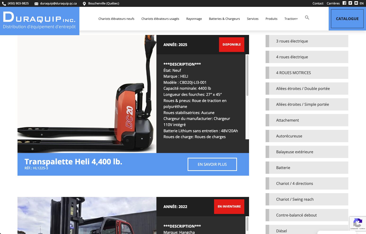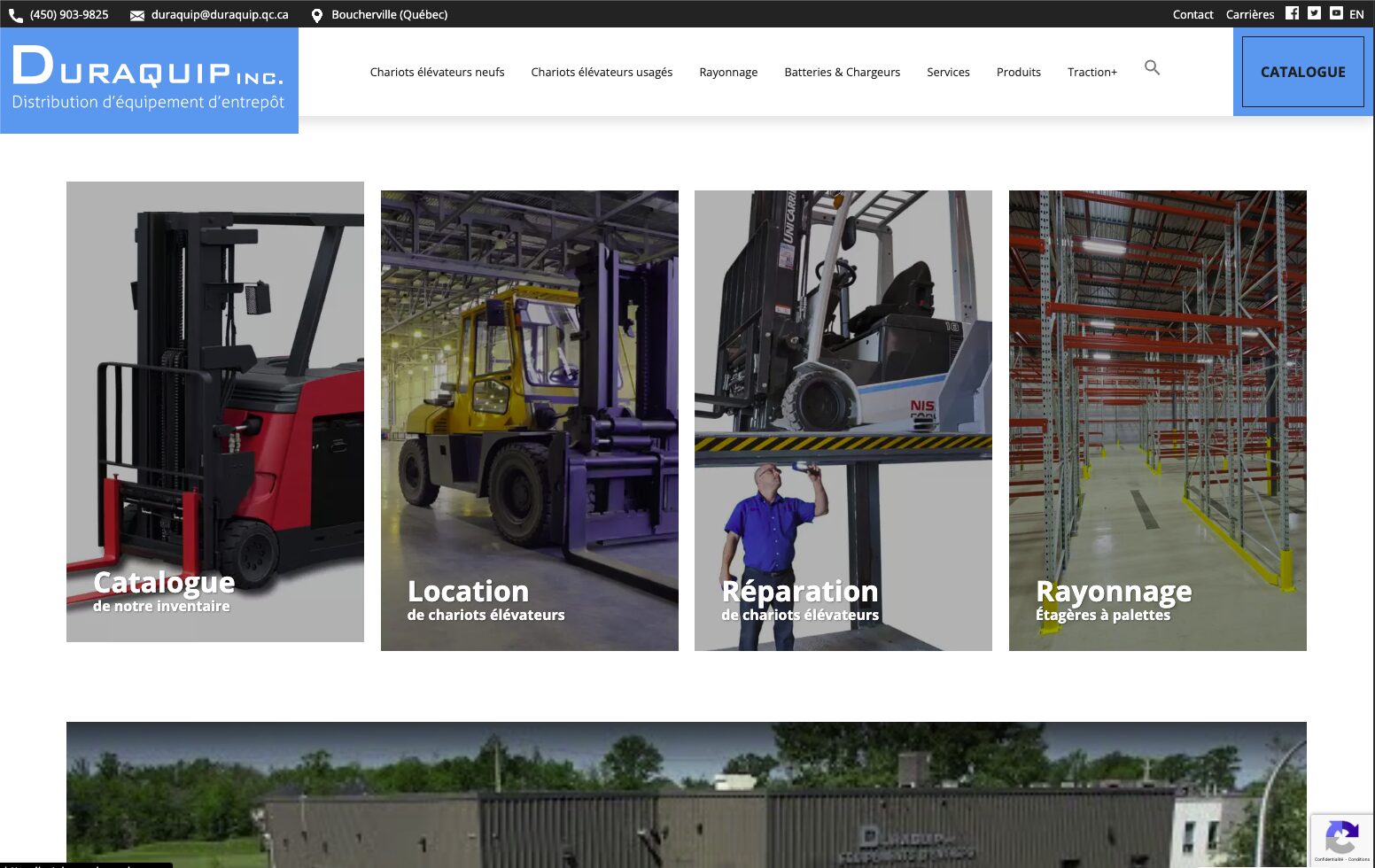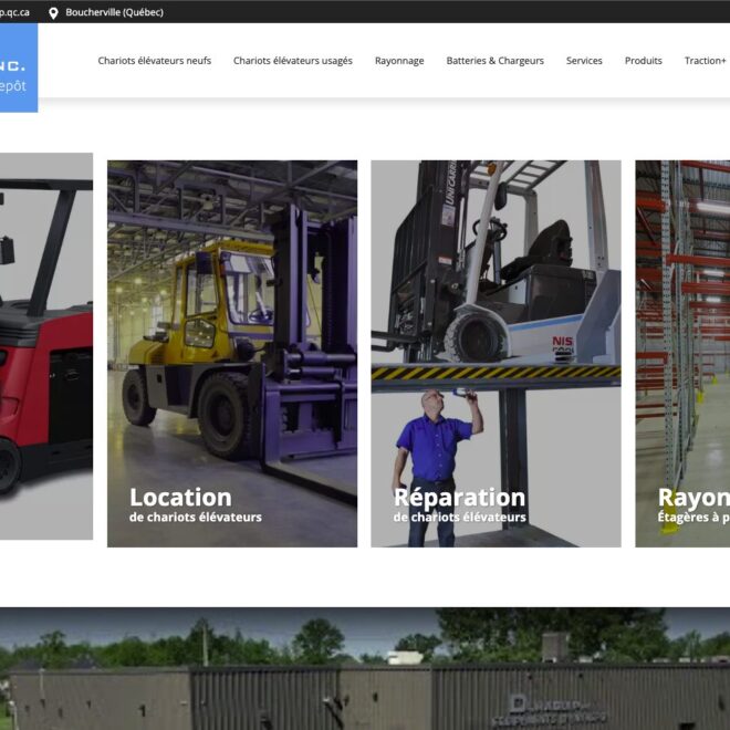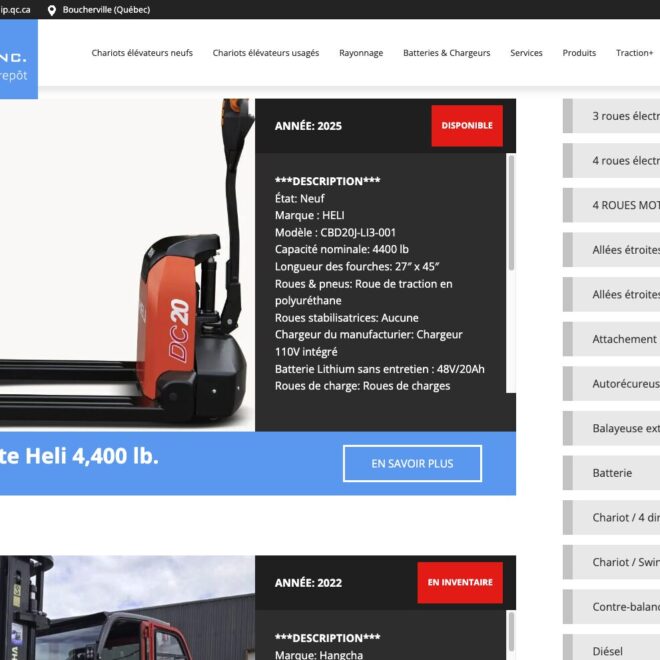 Conception du site web de Duraquip, une entreprise spécialisée dans la vente et l’entretien d’équipements de manutention industrielle. Le site met en valeur l’inventaire de chariots élévateurs, les équipements d’entrepôt et les services techniques offerts par l’entreprise, tout en proposant une navigation claire entre les différentes catégories de produits et solutions destinées aux entreprises.