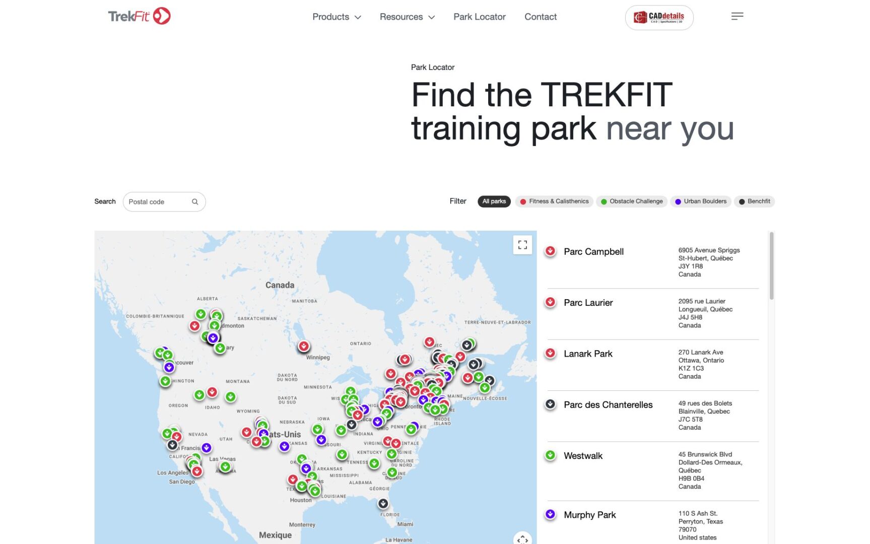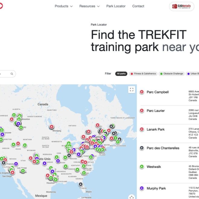 Conception et développement du nouveau site web de Trekfit, une entreprise spécialisée dans les équipements d’entraînement en plein air. Le site se distingue par une approche graphique très poussée, intégrant de nombreuses animations et interactions visuelles. Un plugin personnalisé de localisation permet également de trouver facilement les installations Trekfit à travers une carte interactive.