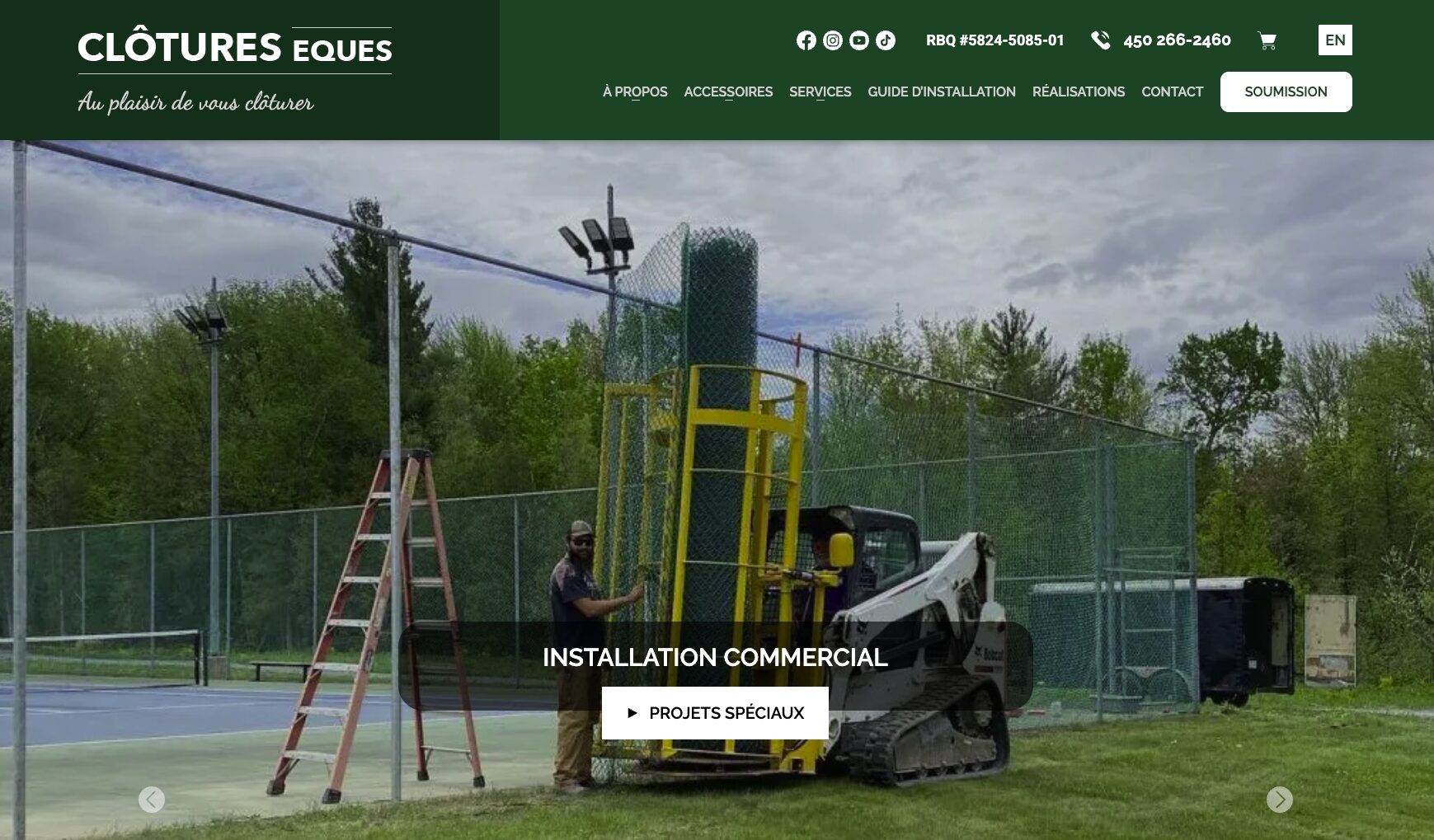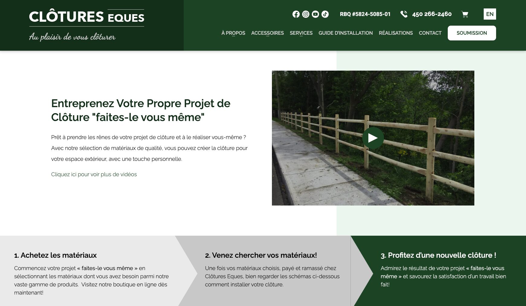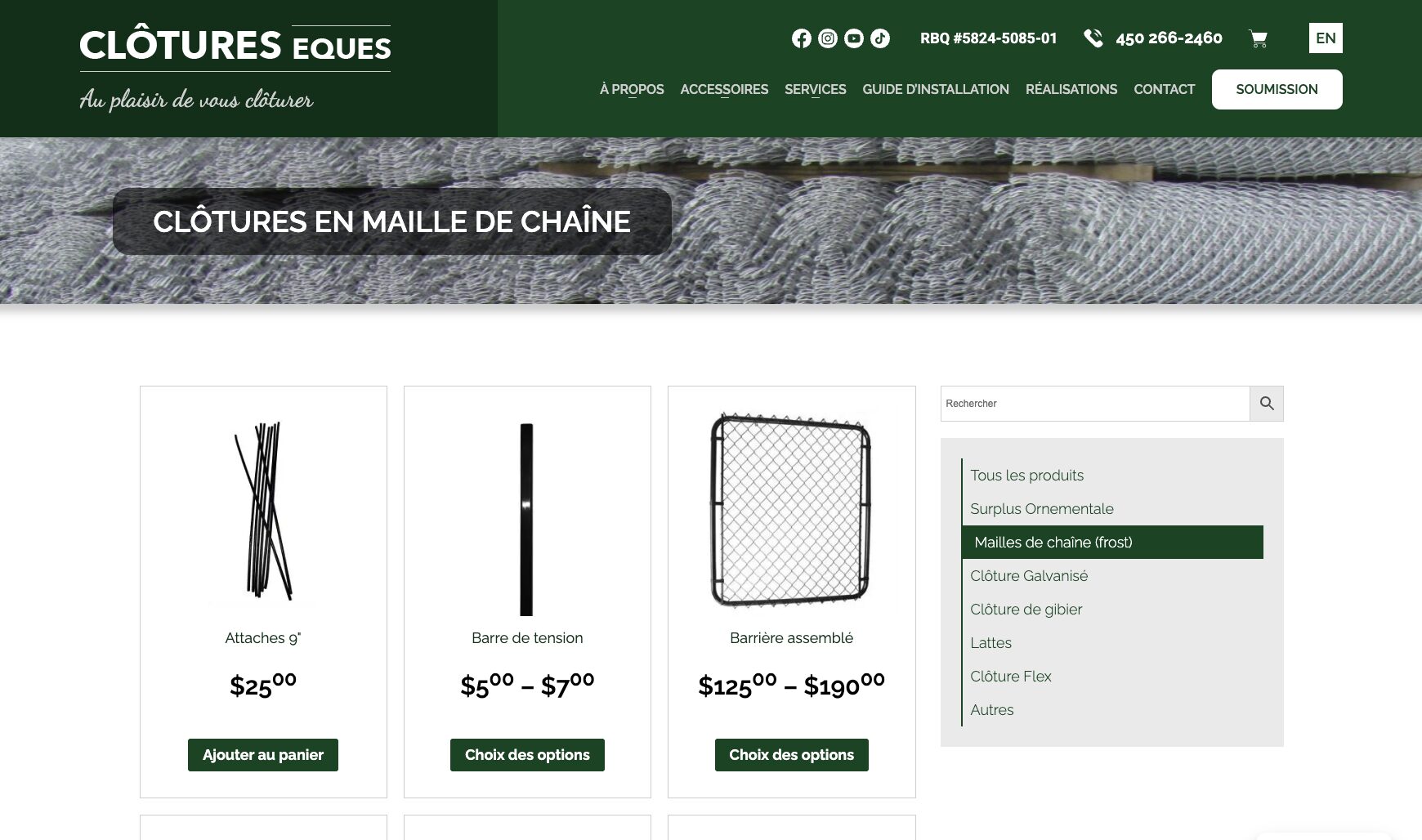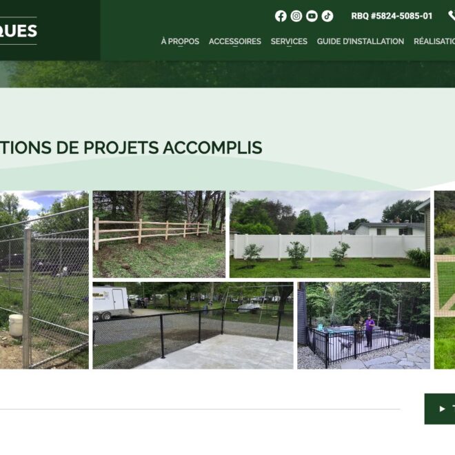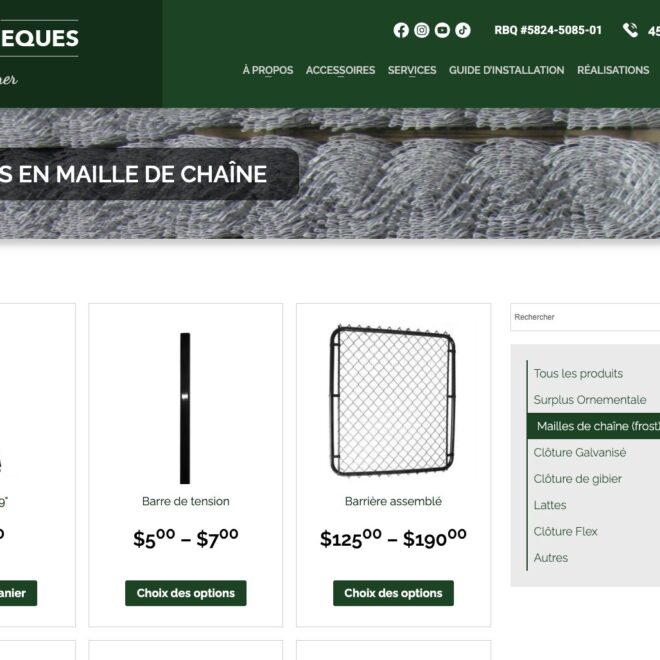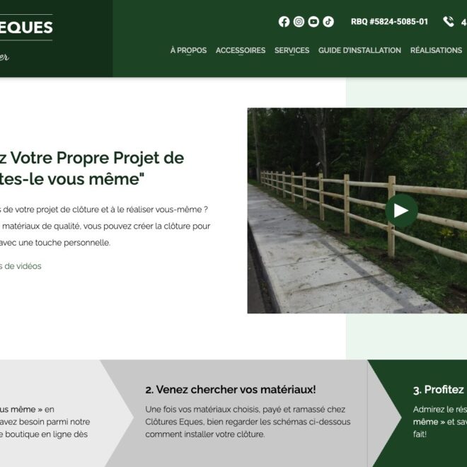 Conception du site web de Clôtures Éques, une entreprise spécialisée dans la vente et l’installation de clôtures résidentielles, commerciales et agricoles. Le site met en valeur les services, les réalisations et les différents produits offerts, tout en intégrant une boutique en ligne permettant aux clients d’acheter des matériaux et accessoires pour leurs projets de clôture.