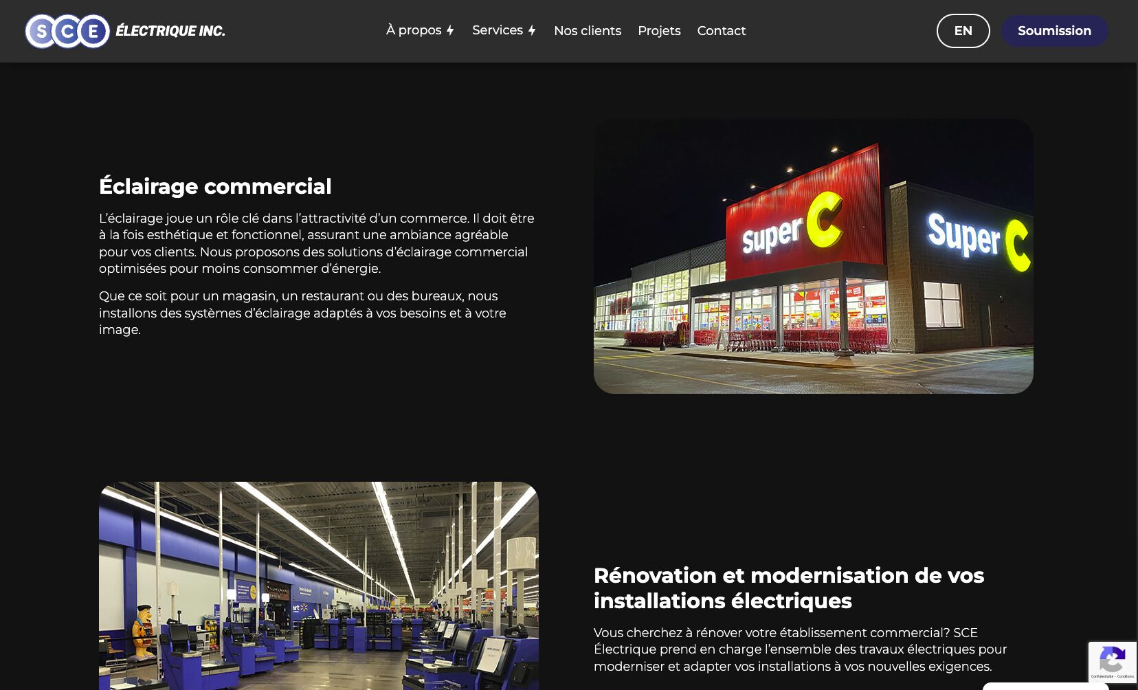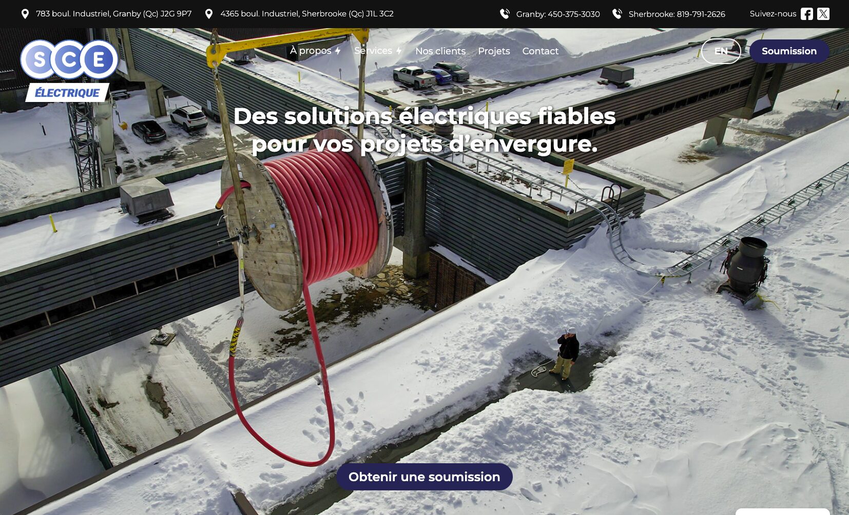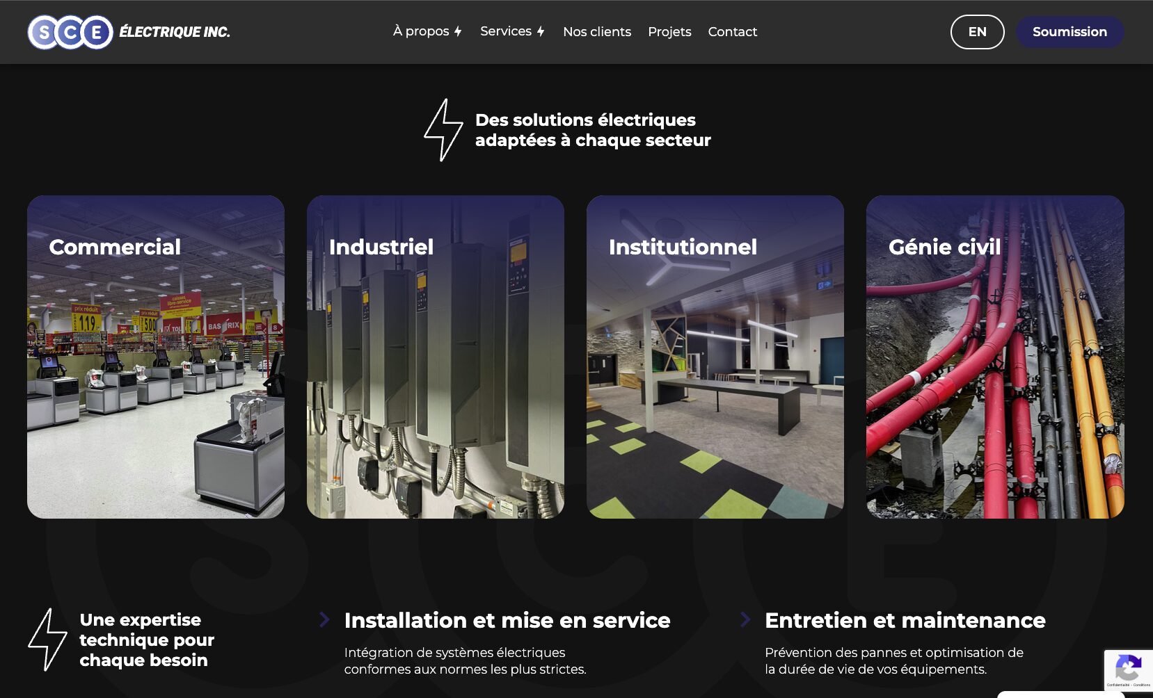 Création du site web de SCE Électrique, un entrepreneur spécialisé dans les projets électriques commerciaux, industriels et de génie civil. Le site présente clairement l’étendue des services offerts et les secteurs d’intervention de l’entreprise, tout en mettant en valeur son expertise et ses réalisations afin de faciliter les demandes de soumission.